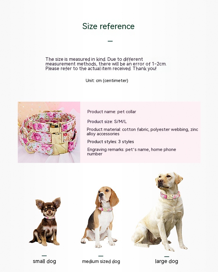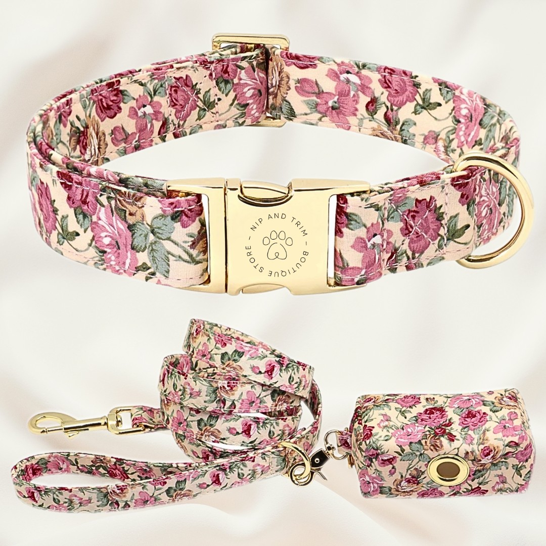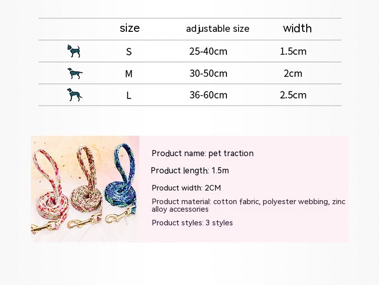 Available in multiple sizes (S, M, L) and a variety of eye-catching colors and patterns, you can choose the perfect look that suits your furry friend's unique style. Whether it’s a pink floral set, classic beige collar, or a vibrant blue collar leash, our collection has something for every pet.